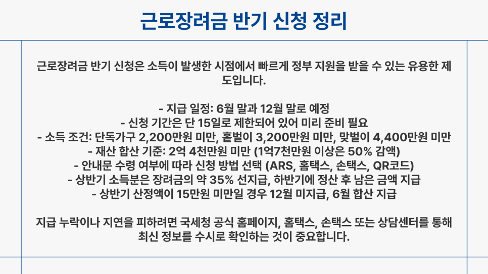 신청 방법은 간단하지만, 처음 근로장려금을 신청하시는 분들은 반드시 정기 신청을 먼저 완료해야 한다는 점을 다시 한번 강조합니다. 또한, 상반기 신청을 하시면 하반기 신청은 자동으로 연계되지만, 한 번만 신청해도 된다는 점도 알아두시면 편리할 거예요.