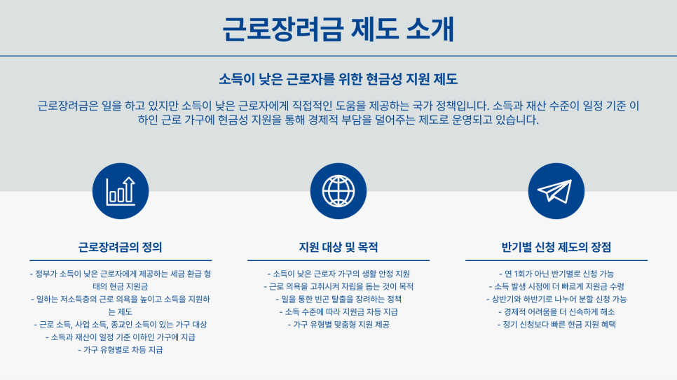 근로장려금은 저소득 근로 가구를 지원하는 중요한 제도입니다. 단순히 돈을 주는 것이 아니라, 근로를 장려하고 생활 안정을 돕는 역할을 해요. 반기 신청 제도로 더욱 편리하게 지원금을 받을 수 있게 되었답니다.