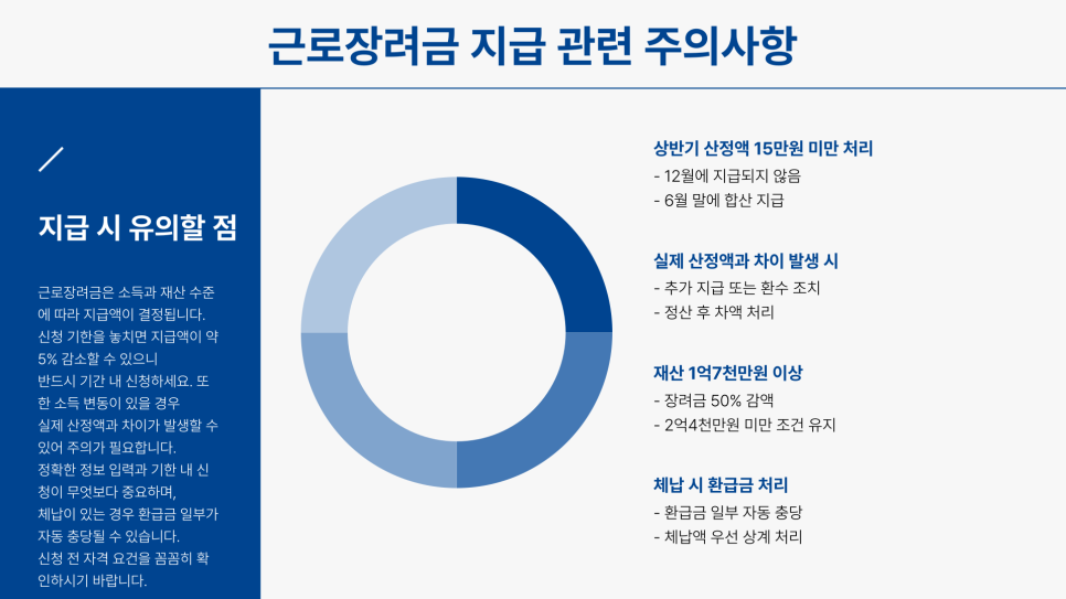 다만, 상반기 소득분 신청 시에는 장려금 산정 금액의 약 35%만 먼저 지급되고, 하반기 소득분 신청 시 나머지 금액을 지급하며 연 소득을 기준으로 정산하는 점을 꼭 기억해주세요. 만약 상반기 산정 금액이 15만원 미만이라면 12월에 지급되지 않고 6월 말에 합산되어 지급될 수 있으니 이 점도 참고하시면 좋겠습니다. 근로장려금은 가구 유형, 재산 수준, 소득액에 따라 지급 금액이 달라지며, 기한 후에 신청하면 지급액이 줄어들 수 있고, 재산이 일정 수준을 넘으면 장려금이 줄거나 지급되지 않을 수도 있으니 꼼꼼히 확인하는 것이 중요해요.