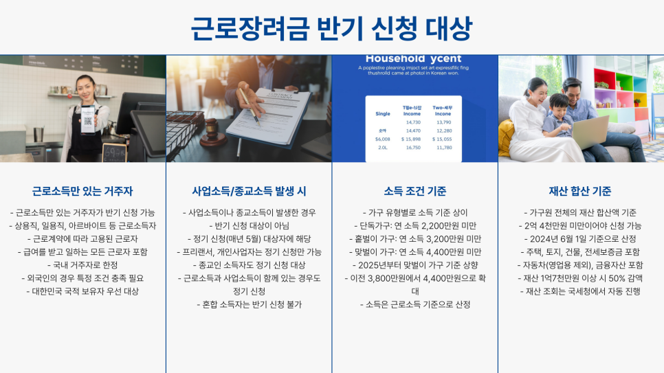 2025년 근로장려금 반기 신청 대상은 근로소득만 있는 거주자입니다. 사업소득이나 종교소득이 있다면 정기 신청 대상에 해당돼요. 소득 조건과 재산 합산 기준을 꼼꼼히 확인해야 합니다.