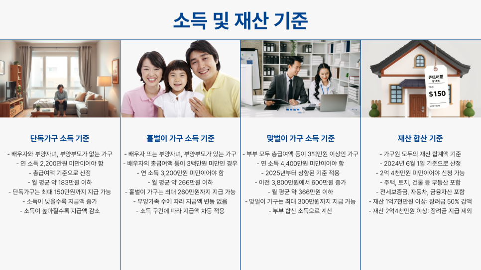 만약 소득과 재산 요건을 모두 충족한다면, 반기 신청을 통해 소득이 발생한 시점에 맞춰 빠르게 지원금을 받을 수 있습니다. 상반기 소득분과 하반기 소득분을 나누어 신청하는 방식으로, 생활에 필요한 자금을 보다 유연하게 활용할 수 있도록 도와줍니다.