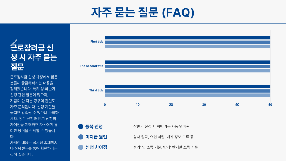 정기 신청과 반기 신청의 차이점도 알아두시면 도움이 될 거예요. 정기 신청은 1년 전체 소득을 기준으로 지급되는 반면, 반기 신청은 상반기와 하반기 각각의 소득을 기준으로 지급됩니다. 기한 후에 신청하시면 장려금이 감액될 수 있으며, 최대 4개월 이내에 지급될 수 있다는 점도 잊지 마세요.
