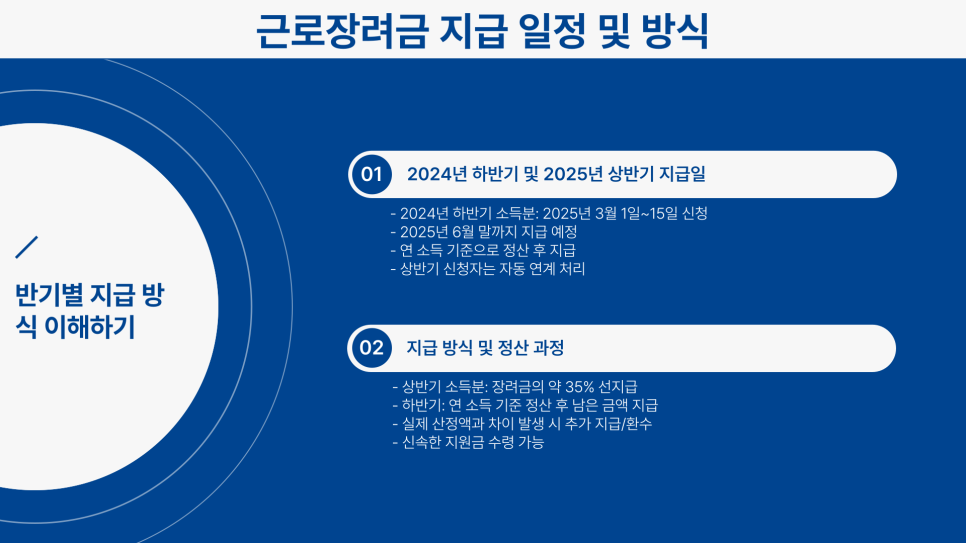 2024년 하반기 소득분은 2025년 3월 1일부터 15일까지 신청, 6월 말까지 지급됩니다. 2025년 상반기 소득분은 9월 1일부터 15일까지 신청, 12월 말까지 지급될 예정이에요. 상반기 소득분 신청 시에는 장려금 산정 금액의 약 35%만 먼저 지급됩니다.